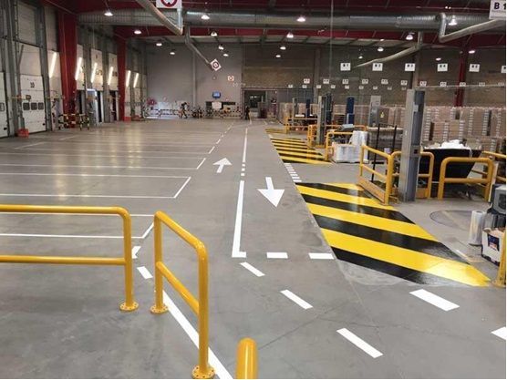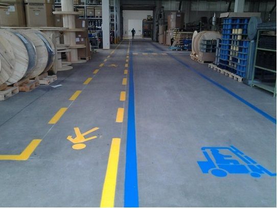 - να υιοθετείται σαφής σήμανση που επιτρέπει μια σαφή ερμηνεία της κυκλοφορίας της εταιρείας, της διάταξης των χώρων και των χώρων και της συνολικής οργάνωσης της εσωτερικής κυκλοφορίας· να προβλεφθεί ο διαχωρισμός των λωρίδων κυκλοφορίας, επισημαίνοντας με ρίγες και εικονογράμματα τους χώρους όπου αποθηκεύονται εμπορεύματα, όπου διέρχονται τρόλεϊ και πεζοί·
