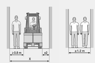 Το ελάχιστο πλάτος (X) των οδών κυκλοφορίας οχημάτων και πεζών προκύπτει προσθέτοντας το πλάτος των μεγαλύτερων οχημάτων ή το φορτίο τους (xl), το ελάχιστο πλάτος των οδών πεζών (0,8 μέτρα) και μια ελάχιστη ανοχή ελιγμών (x2) 0,4 μέτρων.